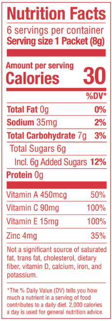 SUGAR, CITRIC ACID, NATURAL AND ARTIFICIAL FLAVORS, XANTHAN GUM, VITAMIN E ACETATE, CONTAINS 2% OR LESS OF THE FOLLOWING: SODIUM CITRATE, ASCORBIC ACID (VITAMIN C), PECTIN, STEVIA LEAF EXTRACT, MALIC ACID, ZING SULFATE, RETINYL PALMITATE (VITAMIN A), FRUIT AND VEGETABLE JUICE (FOR COLOR).
