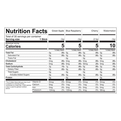 GREEN APPLE: Citric Acid, Malic Acid, Maltodextrin*, Potassium Citrate, Aspartame†, Natural and Artificial Flavors, Contains 2% or less of the following: Acesulfame Potassium, Yellow 5, Yellow 6, Blue 1.