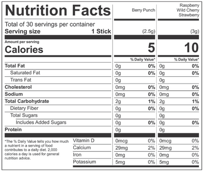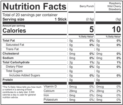 Berry Punch: Citric Acid, Aspartame+, Artificial flavor, monocalcium phosphate, maltodextrin*, magnesium oxide, contains 2% or less of the following: acesulfame potassium, artificial color, vegetable juice color, blue 1. Raspberry: Citric acid, maltodextrin*, aspartame+, natural and artificial flavors, monocalcium phosphate, contains 2% or less of the following: magnesium oxide, acesulfame potassium, artificial color, blue 1, red 40. Wild Cherry: Citric acid, maltodextrin*, aspartame+, artificial flavor, monocalcium phosphate, contains 2% or less of the following: magnesium oxide, acesulfame potassium, artificial color, red 40, blue 1. Strawberry: Citric acid, maltodextrin*, aspartame+, artificial flavor, monocalcium phosphate, contains 2% or less of the following: magnesium oxide, acesulfame potassium, artificial color, red 40, blue 1. *adds a trivial amount of sugar + Phenylketonurics: Contains Phenylalanine