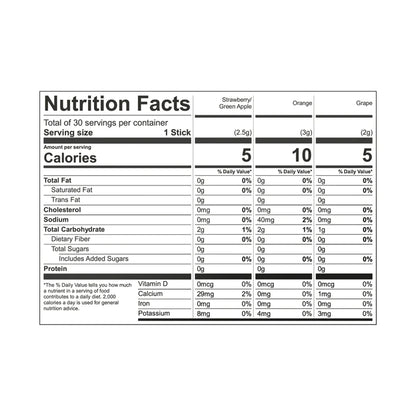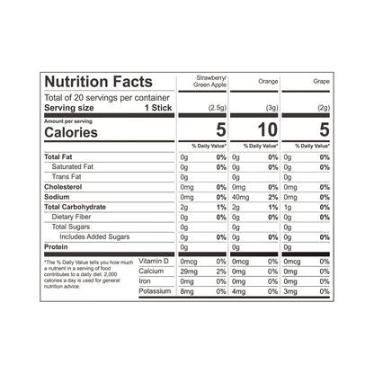 STRAWBERRY: CITRIC ACID, ARTIFICIAL FLAVORS, ASPARTAME†, MALTODEXTRIN*, MONOCALCIUM PHOSPHATE, CONTAINS 2% OR LESS OF THE FOLLOWING: MAGNESIUM OXIDE, ACESULFAME POTASSIUM, ARTIFICIAL COLOR, RED 40, BLUE 1. GREEN APPLE: CITRIC ACID, ASPARTAME†, MALTODEXTRIN*, MONOCALCIUM PHOSPHATE, NATURAL AND ARTIFICIAL FLAVORS, MAGNESIUM OXIDE, CONTAINS 2% OR LESS OF THE FOLLOWING: ACESULFAME POTASSIUM, ARTIFICIAL COLOR, YELLOW 5, BLUE 1. ORANGE: CITRIC ACID, NATURAL AND ARTIFICIAL FLAVORS, ASPARTAME†, MALTODEXTRIN*, SODIUM CITRATE, CONTAINS 2% OR LESS OF THE FOLLOWING: MAGNESIUM OXIDE, SALT, ACESULFAME POTASSIUM, SUCRALOSE, YELLOW 6. GRAPE: CITRIC ACID, ASPARTAME†, MALTODEXTRIN*, MALIC ACID, NATURAL AND ARTIFICIAL FLAVORS, MAGNESIUM OXIDE, CONTAINS 2% OR LESS OF THE FOLLOWING: ARTIFICIAL COLOR, ACESULFAME POTASSIUM, RED 40, BLUE 1. * ADDS A TRIVIAL AMOUNT OF SUGAR † PHENYLKETONURICS: CONTAINS PHENYLALANINE