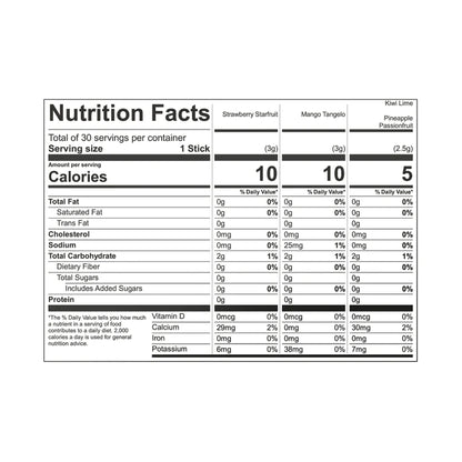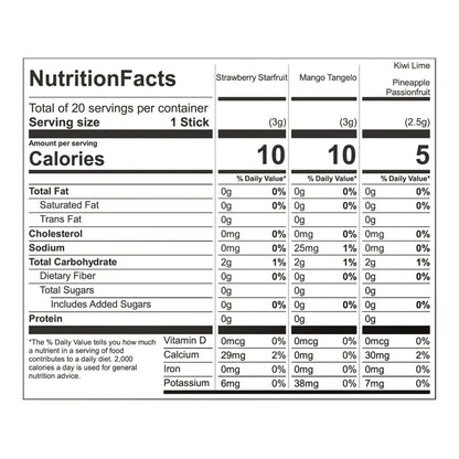 STRAWBERRY STARFRUIT: CITRIC ACID, MALTODEXTRIN*, ASPARTAME†, MONOCALCIUM PHOSPHATE, NATURAL AND ARTIFICIAL FLAVORS, CONTAINS 2% OR LESS OF THE FOLLOWING: MAGNESIUM OXIDE, ACESULFAME POTASSIUM, ARTIFICIAL COLOR, RED 40, YELLOW 5, BLUE 1. MANGO TANGELO: CITRIC ACID, MALTODEXTRIN*, ASPARTAME†, NATURAL AND ARTIFICIAL FLAVORS, POTASSIUM CITRATE, SODIUM CITRATE, CONTAINS 2% OR LESS OF THE FOLLOWING: ACESULFAME POTASSIUM, ARTIFICIAL COLOR, YELLOW 5, RED 40. KIWI LIME: CITRIC ACID, ASPARTAME†, MALTODEXTRIN*, NATURAL AND ARTIFICIAL FLAVORS, MONOCALCIUM PHOSPHATE, CONTAINS 2% OR LESS OF THE FOLLOWING: MAGNESIUM OXIDE, ACESULFAME POTASSIUM, ARTIFICIAL COLOR, YELLOW 5, BLUE 1. PINEAPPLE PASSIONFRUIT: CITRIC ACID, ASPARTAME†, MALTODEXTRIN*, MALIC ACID, MONOCALCIUM PHOSPHATE, NATURAL AND ARTIFICIAL FLAVORS, CONTAINS 2% OR LESS OF THE FOLLOWING: MAGNESIUM OXIDE, ACESULFAME POTASSIUM, CALCIUM SILICATE, ARTIFICIAL COLOR, BLUE 1, RED 40. * ADDS A TRIVIAL AMOUNT OF SUGAR